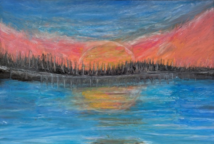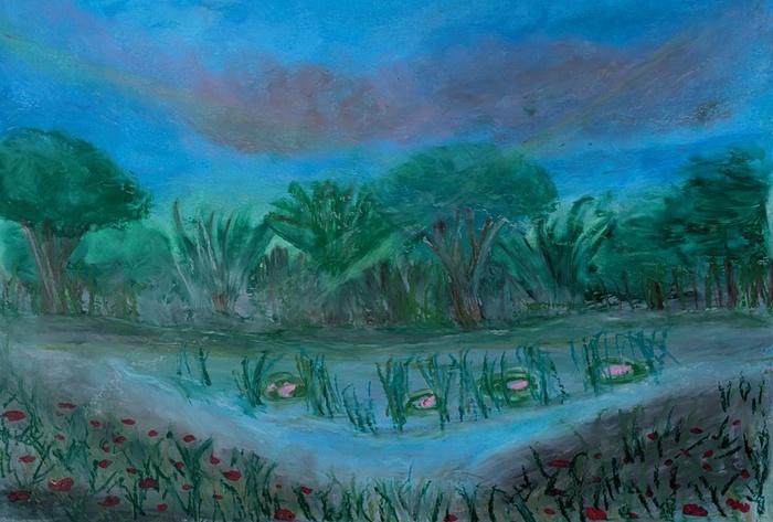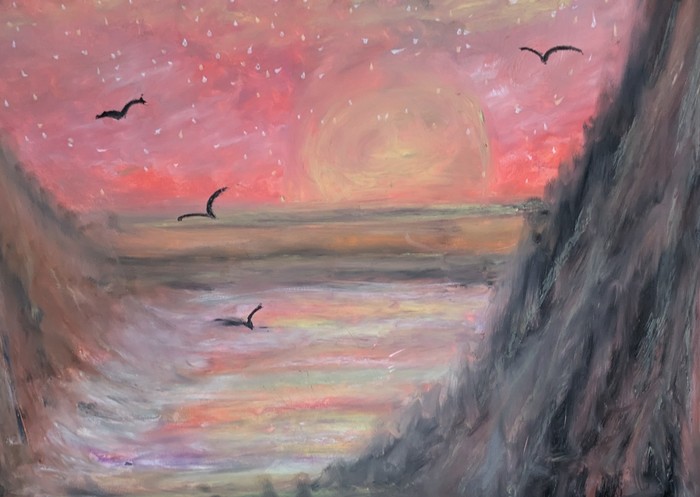 Instead, I turned inward — and outward — toward the natural world, toward meditation, and toward quiet spiritual figures that seemed to emerge from the landscapes of my imagination. Working with oil pastels, I allowed softness, spontaneity, and simplicity to guide me.