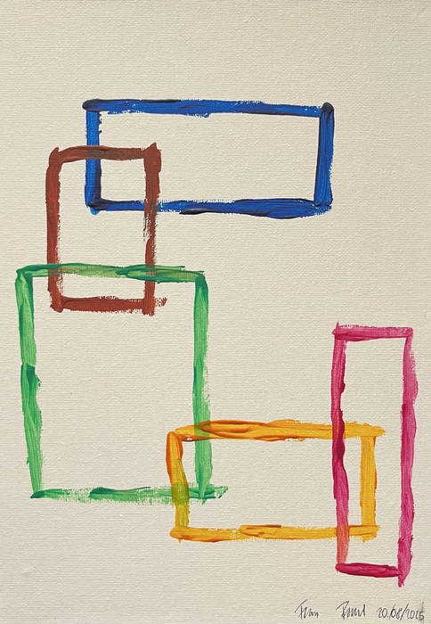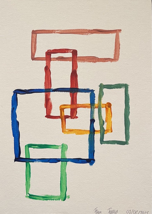 Boundaries explores structure and freedom through bold rectangles. Nine works form a visual dialogue where order meets openness, showing how limits can both confine and connect.
