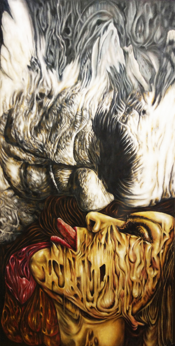 Here, bodies twist, faces disintegrate, and forms seem to crawl out of the subconscious into an uncertain materiality. Skin transforms into landscape; cracks and textures evoke the erosion of memory, while objects appear to have been extracted from a symbolic universe that defies rational logic. The work stands as a visual testimony of a psyche in crisis—a labyrinth where identity dissolves and consciousness becomes trapped in a hall of mirrors.