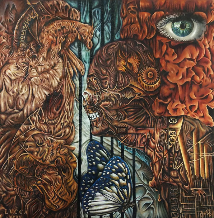 The symbolism within these works is rooted in the tradition of visionary art—one that seeks to open pathways to hidden dimensions. Elements such as the butterfly, the chameleon, and the presence of mutating anthropomorphic forms suggest constant metamorphosis, a transition between states of consciousness. The recurring presence of the eye as a central element evokes surveillance and self-awareness, recalling Michel Foucault’s concept of the panopticon: a structure of power in which the subject is constantly observed, leading to self-regulation.